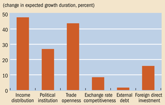 English: Percentage changes in GDP growth spell length as each factor moves from 50th to 60th percentile and all other factors are held constant. Income distribution is measured by the Gini coefficient. Political institutions are measured by the Polity IV Project scale. Exchange rate competitiveness is measured by rate deviation from purchasing power parity adjusted for per capita income.