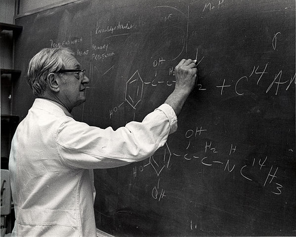 Axelrod.jpg Dr. Julius Axelrod checking a student's work on the chemistry of catecholamine reactions in nerve cells.