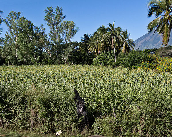 English: A field of Sorghum, seen from the Highway, in El Salvador. The volcano Chaparrastique can be seen in the distance.