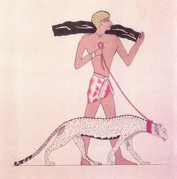 English: A tribesman bringing a cheetah and ebony as tribute to the King of Thebes (c. 1700 B.C.)