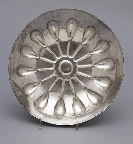 English: Among the most splendid of Achaemenid arts are hammered-silver or gold vessels. This type of bowl, known by the Greek word "phiale," meaning shallow vessel, was used for ritual liquid offerings. The depressions take the form of lotus buds, an Egyptian motif that became popular among the Persians.