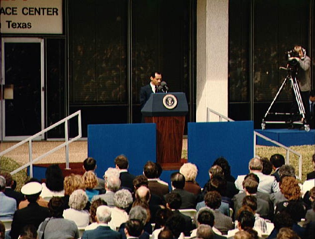 English: Astronaut Charles F. Bolden reads a passage from the Bible during memorial services for the seven crewmemebers of 51-L who lost their lives aboard the Space Shuttle Challenger in a Florida accident