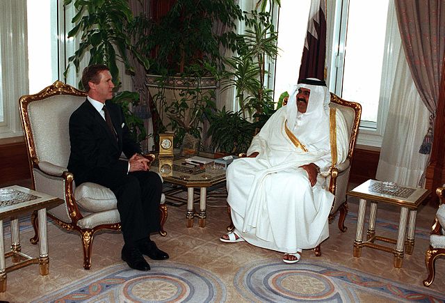 English: His Highness the Emir Sheikh Hamid Bin Khalifa Al-Thani (right) is visited by Secretary of Defense William S. Cohen (left) at his Emiri Diwan in Qatar on Feb. 11, 1998.