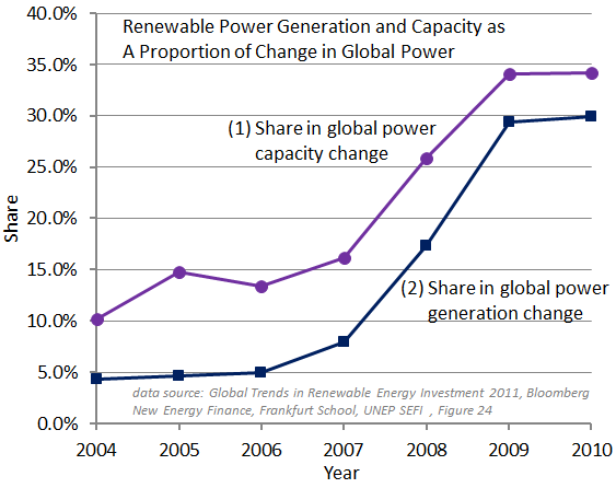 English: Renewable Power Generation and Capacity as a Proportion of Change in Global Power Supplydata source: Global Trends in Renewable Energy Investment 2011, Bloomberg New Energy Finance, Frankfurt School, UNEP SEFI, Figure 24 http://www.unep.org/Renewable_Energy_Investment/