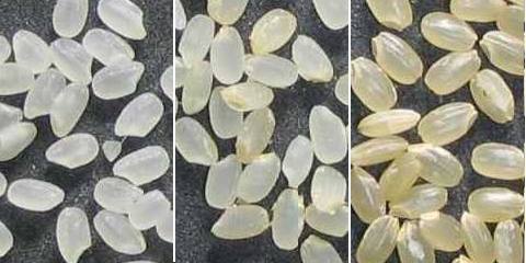 (精白度の異なる米:左から、白米、胚芽米、玄米 {{GFDL}}) |