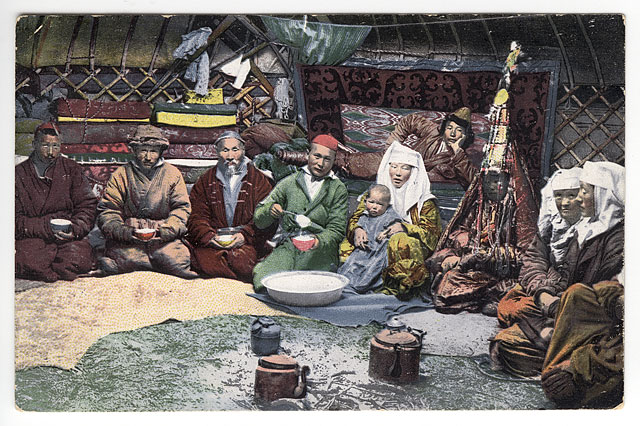 Nederlands: Binnenzijde van een Kazachse yurt met Kazachse familie. Vrouw in traditioneel bruidsgewaad aan rechterzijde