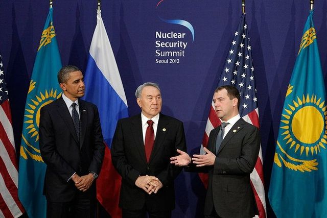 Русский: С Президентом Казахстана Нурсултаном Назарбаевым и Президентом США Бараком Обамой.