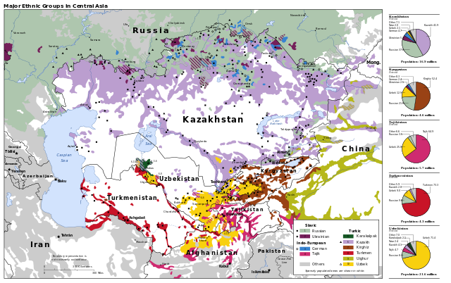 English: Map of the Ethno-Linguistic groups of central Asia (english version).