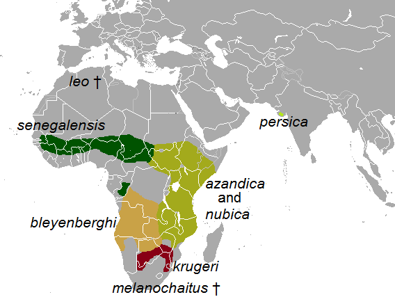 English: Range map of the commonly accepted subspecies of the lion (Panthera leo) in the second half of the 20th century (azandica and nubica are not seperately distinguished because the type specimen of azandicus (northeastern Kongo) does not fit into the subspecies range in the original map)