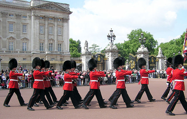 Guards march out of Buckingham Palace (London, England) at the end of the Changing of the Guard ceremony. Photographed by Adrian Pingstone in June 2005 and released to the public domain.