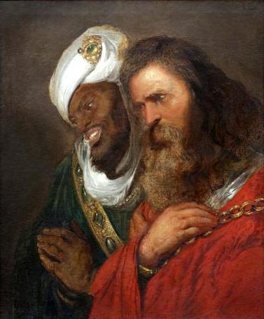 This masterpiece depicts two of the most important men in the crusader era after a decisive moment in battle. King Guy of Lusignan has been portrayed with Christian royal red cloathing and King Saladin has been portrayed with royal Islamic green cloathing. King Lusignan is held captive in golden chains while wearing his armor underneath his cloathing. King Saladin has been depicted wearing magnificent golden regalia while making a religious shape with his hands. The painting shows us how the western world thought of the crusader era and it's subsequent losses during the first quarter of the seventeenth century.