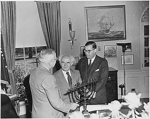 English: Original Caption: Photograph of President Truman in the Oval Office, evidently receiving a Menorah as a gift from the Prime Minister of Israel, David Ben-Gurion (centre), and Abba Eban, the Ambassador of Israel to the United States.: 05/08/1951