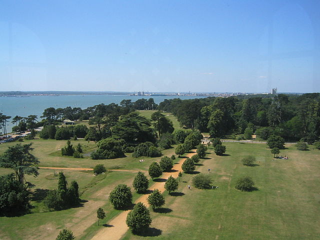 English: View from Netley Hospital chapel tower, in the Royal Victoria Country Park, Netley, Hampshire, UK. Looking north-west across the park, up Southampton Water, towards Southampton. Photo taken by me 2003-06-20.