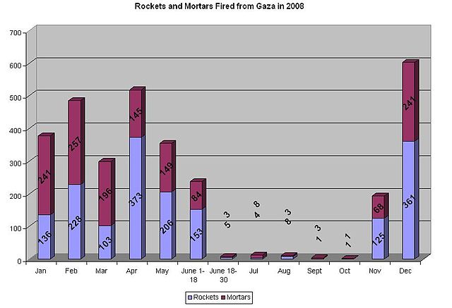 Rockets and Mortars Launched into Israel in 2008. My graph aggregating mortars and rockets from the data provided in http://www.terrorism-info.org.il/malam_multimedia/English/eng_n/pdf/ipc_e007.pdf. |