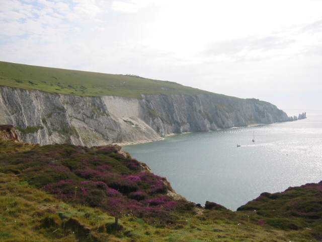 The Needles chalk stacks (right) and Tennyson Down seen from Headon Warren, on the Isle of Wight, in England.