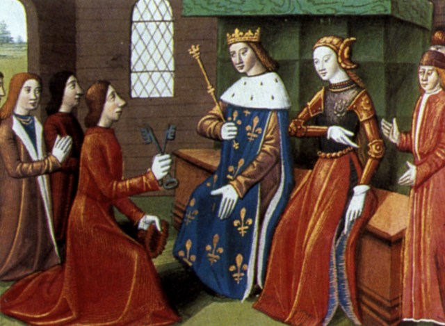 Miniature from Vigiles du roi Charles VII. The citizens of Troyes hand over city keys to the Dauphin and Jeanne. Les citoyens de Troyes remettant les clés de la ville au Dauphin et à Jeanne d'Arc
