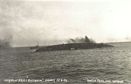 Photograph of Australian battlecruiser  HMAS Australia on her port side and sinking, after being scuttled 24 miles off South Head, Sydney.  HMAS Anzac is in the background. She finally sank at 1451.