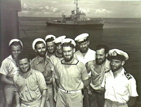 English: AWM Caption: NEW BRITAIN, 1945-09. A GROUP OF AUSTRALIAN SAILORS IN THE RABAUL AREA. BATHURST CLASS MINESWEEPER/CORVETTE HMAS DUBBO IS IN THE BACKGROUND.