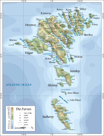 Source Self-made in Inkscape by User:Mysid. Coastline, roads, place names, and summits based on File:Faroe map with villages, streets, straits, firths, ferry harbours and major moutains.png.