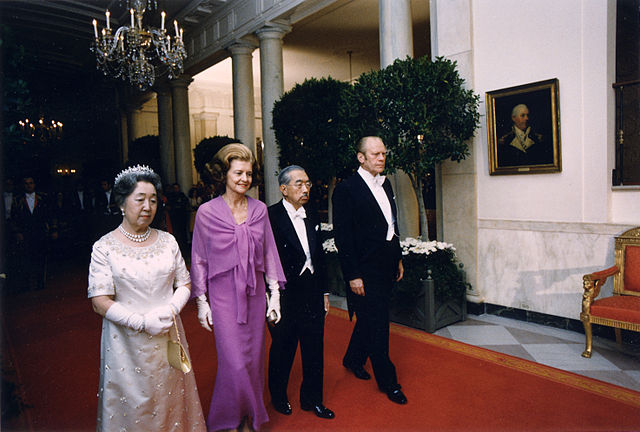 English: (Caption from original) Empress Nagako, Mrs. Ford, Emperor Hirohito and President walk down the Cross Hall towards the East Room prior to a state dinner held in honour of the Japanese head of state