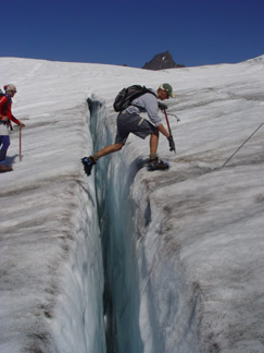 Crossing a crevasse, Easton Glacier, North Cascades (Pelto, http://www.nichols.edu/departments/glacier/)