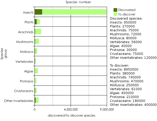 English: A bar chart showing the dicovered and undiscovered species. The data was obtained from The Le monde newspaper article available at  http://www.lemonde.fr/archives/article/2006/06/27/protection-de-la-biodiversite-un-inventaire-difficile_788741_0.html (note: online article however does miss the image on which this bar chart was based; originally based on newspaper clipping)