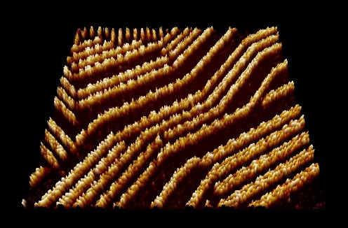 Scanning Tunnelling Microscope image of Quinacridone molecules adsorbed on a Graphite surface. The organic semiconductor molecules self-assembled into nano-chains via Hydrogen-bonds. Nanowire width: 1.6 nm. Image processing Software: SPIP; 3D enhancement was applied.