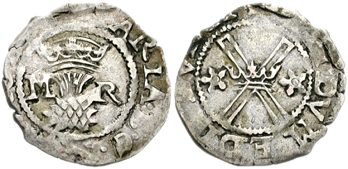 - +MARIA D G REGINA SCOTORV, crowned thistle flanked by M R