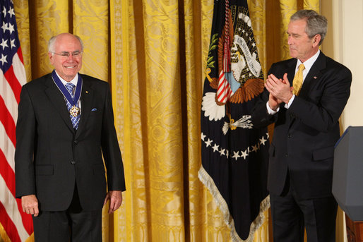 English: President George W. Bush applauds former Prime Minister John Howard after presenting the Australian leader with the 2009 Presidential Medal of Freedom during ceremonies Tuesday, Jan.13, 2009, in the East Room of the White House.