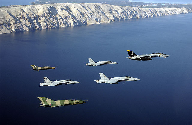 English: Pula, Croatia -- An F-14 “Tomcat” fighter assigned to the “Jolly Rogers” of Fighter Squadron One Zero Three (VF-103) leads a formation comprised of F/A-18 “Hornet” strike fighters from the “Blue Blasters” of VFA-34, the “Sunliners” of VFA-81, and the “Rampagers” of VFA-83. U.S. aircraft belong to Carrier Air Wing Seventeen (CVW-17), currently embarked on board. Two Croat MiG-21 “Fishbed” fighter-interceptors flank the each side of the formation. U.S. Navy aviation squadrons assigned to Carrier Air Wing Seventeen (CVW-17) have sent a detachment to Croatia in order to participate in Joint Wings 2002. Joint Wings is a multinational exercise between the U.S. and the Croat Air Force designed to practice intelligence gathering. George Washington is homeported in Norfolk, Va., and is nearing the end of a scheduled six month deployment after completing combat missions in support of Operations Enduring Freedom and Southern Watch. U.S. Navy photograph by CAPT Dana Potts. (RELEASED)