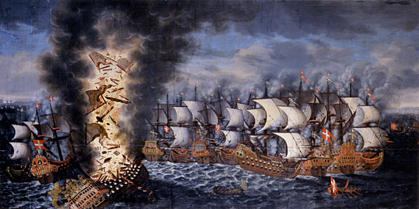 Slaget ved Øland sommeren 1676. Den danske og nederlandske flåte beseirer den svenske. Datidens største orlogsskip, Kronan, blir senket. Maleri av Claus Møinichen, 1686.