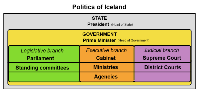English: A graphical representation of the political system of Iceland and the separation of powers.