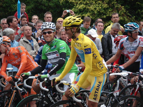 Español: Alberto Contador y Thor Hushovd en la salida de la 17ª etapa del Tour de Francia 2010, entre Pau y el Col du Tourmalet.