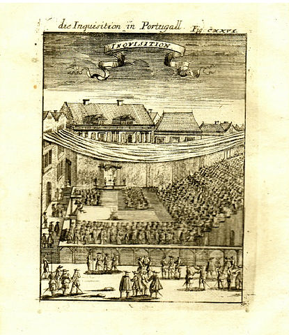 "Die Inquisition in Portugall" - Original Miniature Copper Engraving from the book: "Description de L'Univers, Contenant les Différents Systèmes de Monde, Les Cartes Générales & Particulières de la Géographie Ancienne & Moderne."