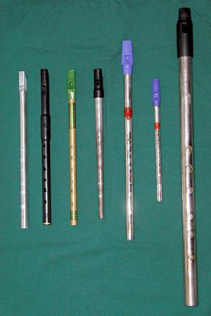 Tinwhistles: Overton aluminium D by Colin Goldie, Tony Dixon PVC D, Feadog brass D, all cylindrical; Clarke "Sweetone" D, conical; Generation nickel low Bb and high G; Howard low D.