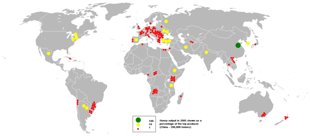 English: This bubble map shows the global distribution of (natural) honey output in 2005 as a percentage of the top producer (China - 298,000 tons).