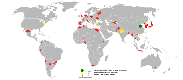 This bubble map shows the global distribution of onion and shallot output in 2005 as a percentage of the top producer (China - 19,793,000 tonnes).