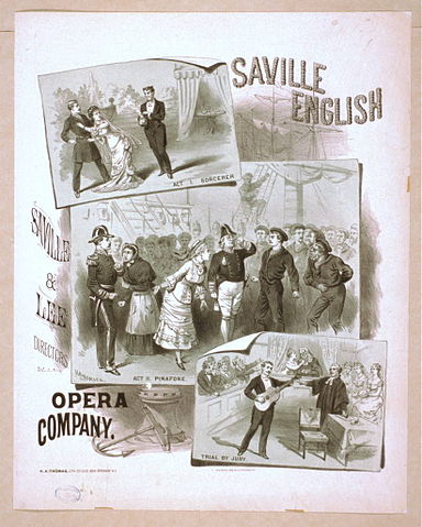 • Poster advertising operettas by Gilbert & Sullivan; includes Sorcerer, H.M.S. Pinafore, and Trial by jury.