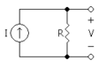 A voltage source, V, driving a resistor, R, and creating an electric current I.