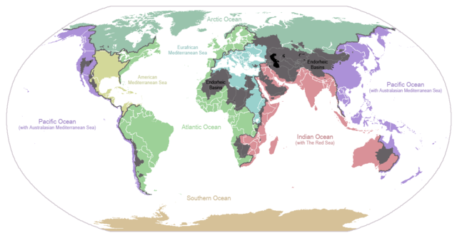 English: I made this map and hereby release it into the public domain. It shows the drainage basins for the major oceans and seas; grey areas are  endorheic basins that do not drain to the ocean. Data is from the  USGS Hydro1k project; information for Saskatchewan corrected by information from the  Commission for Environmental Cooperation --  Citynoise  Description in large font size is used for oceans, in smaller font size is used for  mediterranean seas. Only these mediterranean seas are listed which correspond to the definition of german Geographer  Ernst Neef: A mediterranean sea is a sea between two Continents. Also found here:  de:Mittelmeer -- W like wiki ( talk) 00:55, 12 March 2011 (UTC)