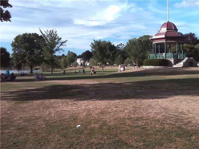 English: The Wakefield, Massachusetts town common shown on the evening of Friday, July 9, 2010, with the gazebo/bandstand at far right and the shores of Lake Quannapowitt at the far left.