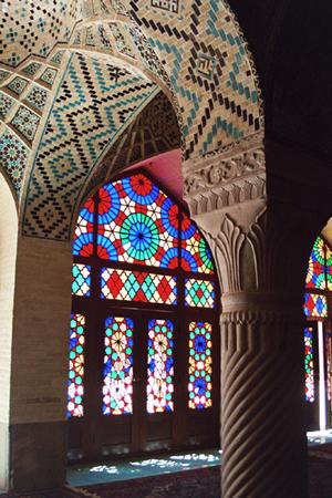 English: Stained glass windows and mosaics in Nasir ol Molk mosque —  Shiraz, Iran.
