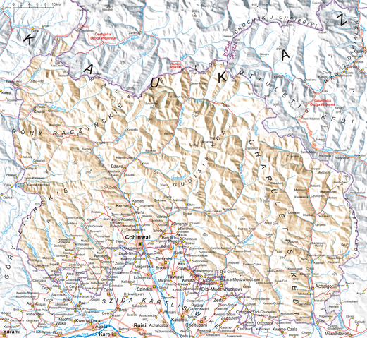 English: Map of South Ossetia, based on Soviet topographic map published in the eighties and Shuttle Radar Topography Mission (STRM). Names are in Polish transcription based on rules of Commission on Standardization of Geographical Names Outside the Republic of Poland. Differences between Polish transcription and English one: C=TS, CH=KH, CZ=CH, DŻ=J, J=Y, Ł=W, SZ=SH, W=V (i.e.: CCHINWALI=TSKHINVALI, MCZADIDŻWARI=MCHADIJVARI, SZUA-CIRI=SHUA-TSIRI etc.)