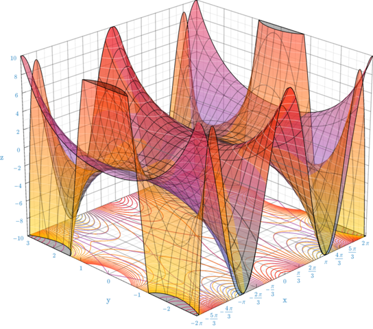 Graphs of z = Re(cos(x+iy)) and an eight-degree taylor series approximation, selfmade with MuPad. |