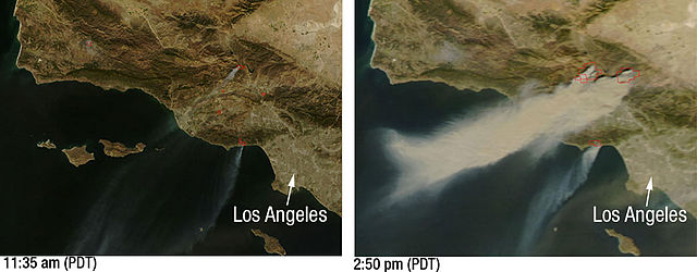 This pair of images, depicting the area around Los Angeles on October 21, 2007, shows just how quickly the fires grew.