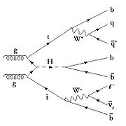 A schematic, called a Feynman diagram, of two virtual gluons from colliding LHC protons interacting to produce a hypothetical Higgs boson, a top quark, and an antitop quark. These in turn decay into a specific combination of quarks and leptons that is very unlikely to be duplicated by other processes. Collecting sufficient evidence of signals like this one may eventually allow ATLAS collaboration members to discover the Higgs boson.