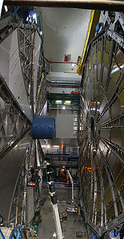ATLAS experiment detector under construction in October 2004 in its experimental pit; the current status of construction can be seen here. Note the people in the background, for comparison.