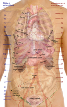 - The second line is the subcostal line, drawn from the lowest point of the subcostal arch ( tenth rib). It corresponds to the upper part of the third lumbar vertebra, and it is an inch or so above the umbilicus. It indicates roughly the transverse colon, the lower ends of the kidneys, and the upper limit of the transverse (3rd) part of the duodenum.