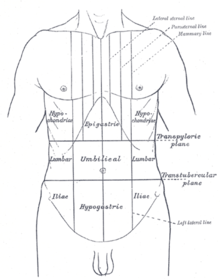 These three horizontal and two vertical lines divide the abdomen into nine "regions." (Note that "hypo" means "below" and "epi" means "above", while "chond" means "cartilage" (in this case, the cartilage of the rib) and "gast" means stomach. The reversal of "left" and "right" is intentional, because the anatomical designations reflect the position on the patient. )