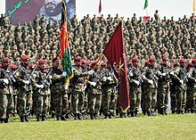 The military of Afghanistan is under the Ministry of Defense, which includes the Afghan National Army (ANA) and the Afghan Air Force (AAF). It currently has about 200,000 active soldiers and is expected to reach 260,000 in the coming years. They are trained and equipped by NATO countries, mainly by the United States Department of Defense. The ANA is divided into 7 major Corps, with the 201st Selab ("Flood") in Kabul followed by the 203rd in Gardez, 205th Atul ("Hero") in Kandahar, 207th in Herat, 209th in Mazar-i-Sharif and the 215th in Lashkar Gah. The ANA also has a commando brigade which was established in 2007. The National Military Academy of Afghanistan serves as the main educational institute for the militarymen of the country. A new $200 million Afghan Defense University (ADU) is under construction near the capital.